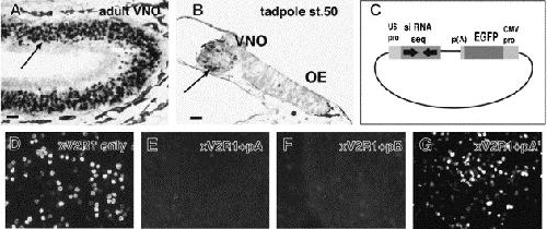 Stable knock-down of vomeronasal receptor genes in transgenic Xenopus tadpoles., Kashiwagi A, Kashiwagi K, Saito S, Date-Ito A, Ichikawa M, Mori Y, Hagino-Yamagishi K., Biochem Biophys Res Commun. June 23, 2006; 345 (1): 140-7.