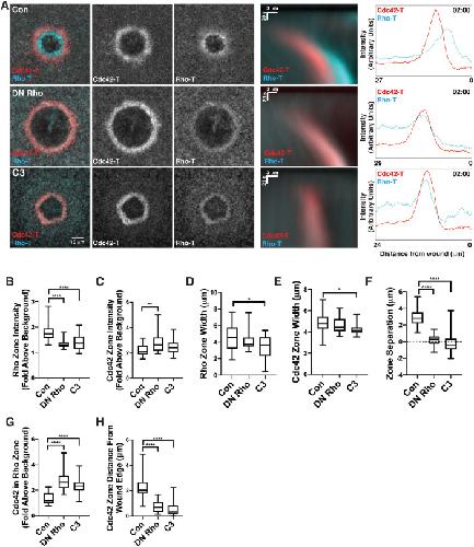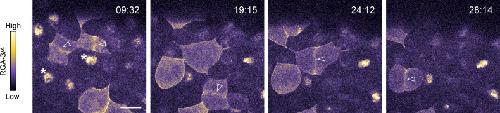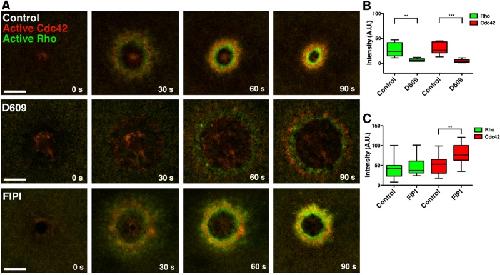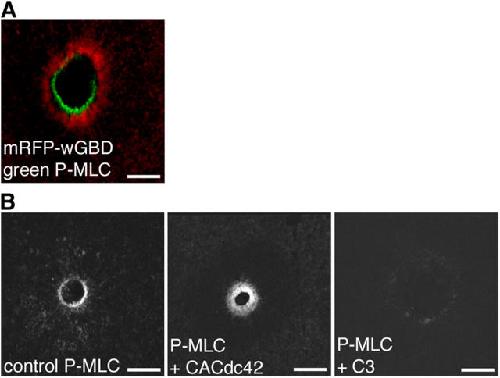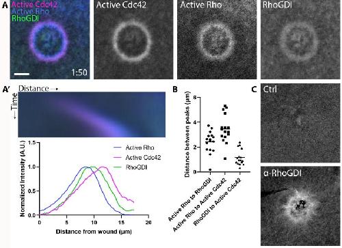 Concentric zones of active RhoA and Cdc42 around single cell wounds., Benink HA, Bement WM., J Cell Biol. January 31, 2005; 168 (3): 429-39.