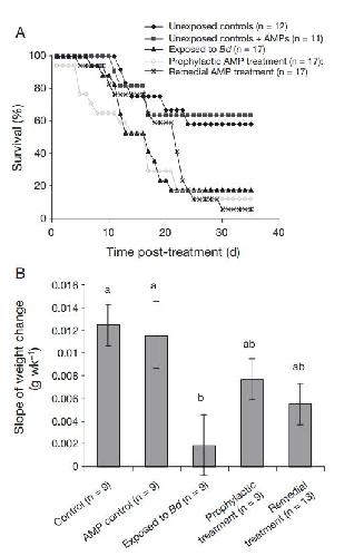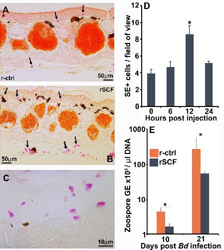 Amphibians acquire resistance to live and dead fungus overcoming fungal immunosuppression. , McMahon TA, Sears BF, Venesky MD, Bessler SM, Brown JM, Deutsch K, Halstead NT, Lentz G, Tenouri N, Young S, Civitello DJ, Ortega N, Fites JS, Reinert LK, Rollins-Smith LA , Raffel TR, Rohr JR., Nature. July 10, 2014; 511 (7508): 224-7.