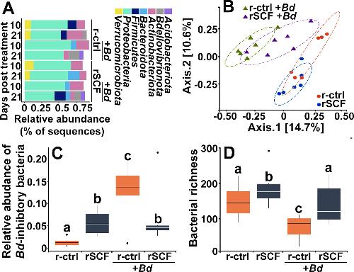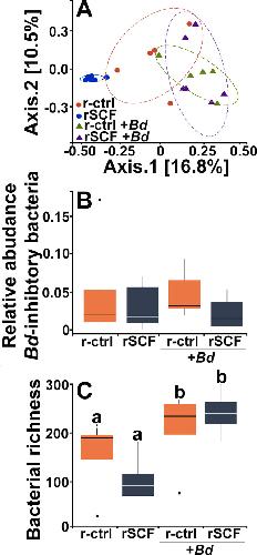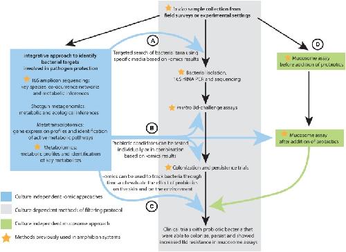 Using "Omics" and Integrated Multi-Omics Approaches to Guide Probiotic Selection to Mitigate Chytridiomycosis and Other Emerging Infectious Diseases. , Rebollar EA, Antwis RE, Becker MH, Belden LK, Bletz MC, Brucker RM, Harrison XA, Hughey MC, Kueneman JG, Loudon AH, McKenzie V, Medina D, Minbiole KP, Rollins-Smith LA , Walke JB, Weiss S, Woodhams DC, Harris RN., Front Microbiol. January 1, 2016; 7 68.