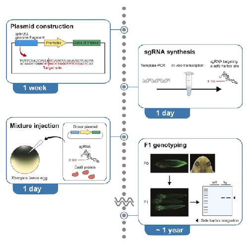 Protocols for transgenesis at a safe harbor site in the Xenopus laevis genome using CRISPR-Cas9. , Shibata Y , Okumura A, Mochii M , Suzuki KT ., STAR Protoc. September 15, 2023; 4 (3): 102382.