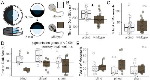 Albino Xenopus laevis tadpoles prefer dark environments compared to wild type., Adebogun GT, Bachmann AE, Callan AA, Khan U, Lewis AR, Pollock AC, Alfonso SA, Arango Sumano D, Bhatt DA, Cullen AB, Hajian CM, Huang W, Jaeger EL, Li E, Maske AK, Offenberg EG, Ta V, Whiting WW, McKinney JE, Butler J, O'Connell LA., MicroPubl Biol. January 1, 2023; 2023