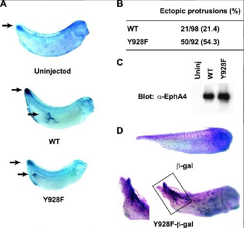 Ectopic EphA4 receptor induces posterior protrusions via FGF signaling in Xenopus embryos. , Park EK, Warner N, Bong YS, Stapleton D, Maeda R , Pawson T, Daar IO ., Mol Biol Cell. April 1, 2004; 15 (4): 1647-55.