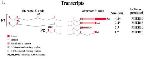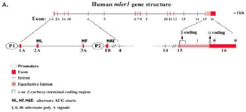 Genomic organization of the human mi- er1 gene and characterization of alternatively spliced isoforms: regulated use of a facultative intron determines subcellular localization. , Paterno GD , Ding Z, Lew YY, Nash GW, Mercer FC, Gillespie LL ., Gene. July 24, 2002; 295 (1): 79-88.