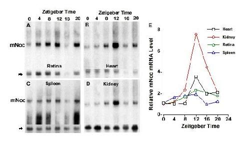 Use of a high stringency differential display screen for identification of retinal mRNAs that are regulated by a circadian clock. , Green CB , Besharse JC ., Brain Res Mol Brain Res. April 1, 1996; 37 (1-2): 157-65.