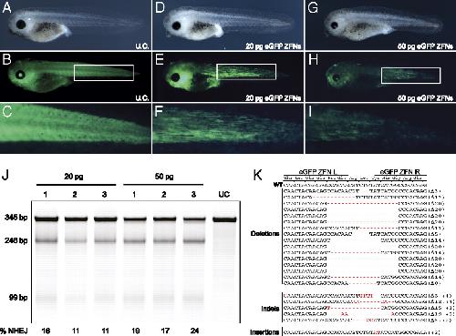 Efficient targeted gene disruption in the soma and germ line of the frog Xenopus tropicalis using engineered zinc-finger nucleases. , Young JJ , Cherone JM, Doyon Y, Ankoudinova I, Faraji FM, Lee AH, Ngo C, Guschin DY, Paschon DE, Miller JC, Zhang L, Rebar EJ, Gregory PD, Urnov FD, Harland RM , Zeitler B., Proc Natl Acad Sci U S A. April 26, 2011; 108 (17): 7052-7.