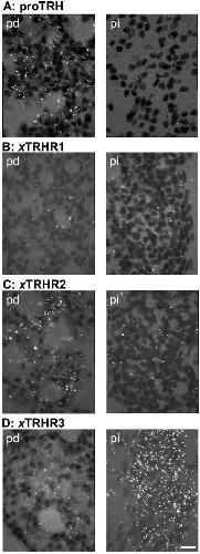 Distribution of the mRNAs encoding the thyrotropin-releasing hormone ( TRH) precursor and three TRH receptors in the brain and pituitary of Xenopus laevis: effect of background color adaptation on TRH and TRH receptor gene expression. , Bidaud I, Galas L, Bulant M, Jenks BG , Ouwens DT, Jégou S, Ladram A, Roubos EW , Tonon MC, Nicolas P, Vaudry H., J Comp Neurol. September 6, 2004; 477 (1): 11-28.