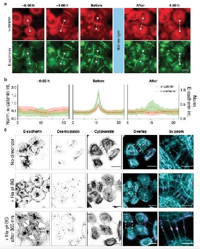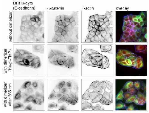 An optochemical tool for light-induced dissociation of adherens junctions to control mechanical coupling between cells. , Ollech D, Pflästerer T, Shellard A, Zambarda C, Spatz JP, Marcq P, Mayor R , Wombacher R, Cavalcanti-Adam EA., Nat Commun. January 24, 2020; 11 (1): 472.