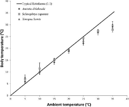 The role of ambient temperature and body mass on body temperature, standard metabolic rate and evaporative water loss in southern African anurans of different habitat specialisation. , Mokhatla M, Measey J , Smit B., PeerJ. May 1, 2019; 7 e7885.