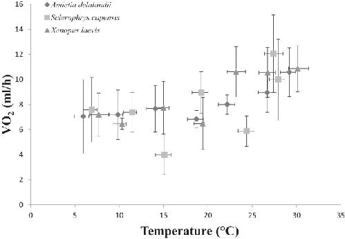 Rapid Shifts in the Temperature Dependence of Locomotor Performance in an Invasive Frog, Xenopus laevis, Implications for Conservation. , Araspin L, Martinez AS, Wagener C, Courant J, Louppe V, Padilla P, Measey J , Herrel A., Integr Comp Biol. August 1, 2020; 60 (2): 456-466.