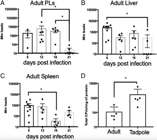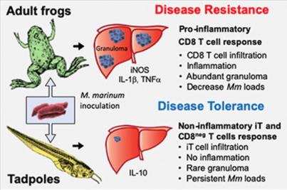 Distinct Host-Mycobacterial Pathogen Interactions between Resistant Adult and Tolerant Tadpole Life Stages of Xenopus laevis., Rhoo KH, Edholm ES, Forzán MJ, Khan A, Waddle AW, Pavelka MS, Robert J., J Immunol. November 15, 2019; 203 (10): 2679-2688.