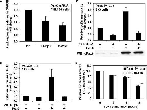 The MH1 domain of Smad3 interacts with Pax6 and represses autoregulation of the Pax6 P1 promoter., Grocott T, Frost V, Maillard M, Johansen T, Wheeler GN, Dawes LJ, Wormstone IM, Chantry A., Nucleic Acids Res. January 1, 2007; 35 (3): 890-901. |