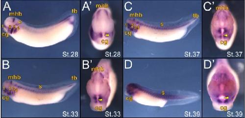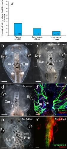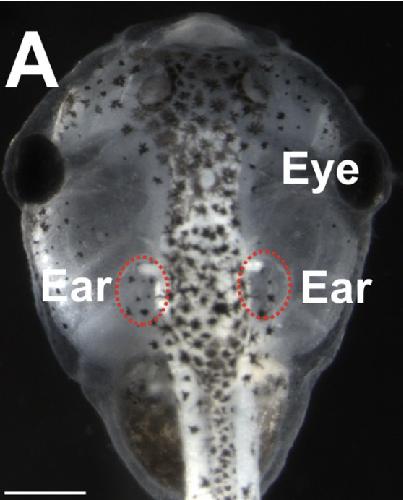 Sensory afferent segregation in three-eared frogs resemble the dominance columns observed in three-eyed frogs. , Elliott KL, Houston DW , Fritzsch B ., Sci Rep. February 9, 2015; 5 8338.
