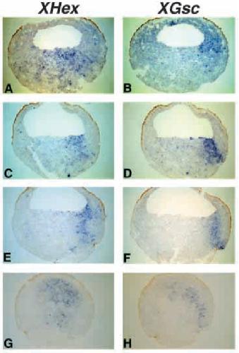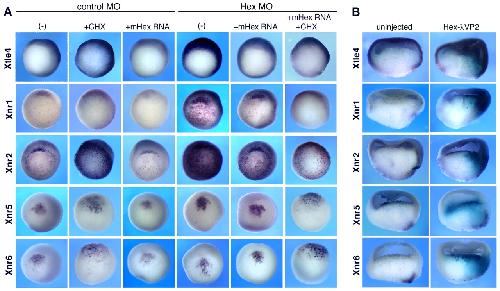Hex is a transcriptional repressor that contributes to anterior identity and suppresses Spemann organiser function., Brickman JM, Jones CM, Clements M, Smith JC, Beddington RS., Development. June 1, 2000; 127 (11): 2303-15. |