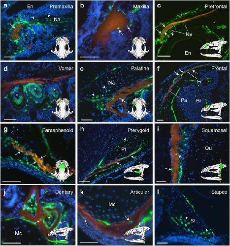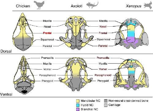 Cranial neural crest contributes to the bony skull vault in adult Xenopus laevis: insights from cell labeling studies., Gross JB, Hanken J., J Exp Zool B Mol Dev Evol. March 15, 2005; 304 (2): 169-76.