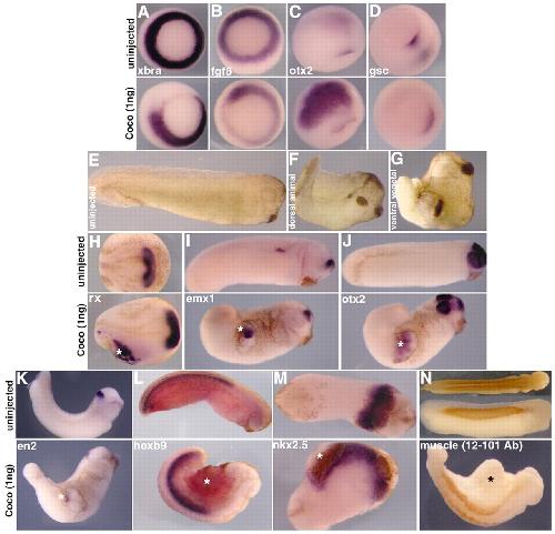 Cell fate specification and competence by Coco, a maternal BMP, TGFbeta and Wnt inhibitor. , Bell E , Muñoz-Sanjuán I, Altmann CR , Vonica A, Brivanlou AH ., Development. April 1, 2003; 130 (7): 1381-9.