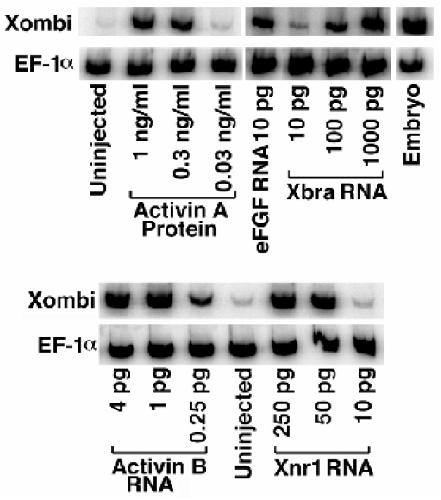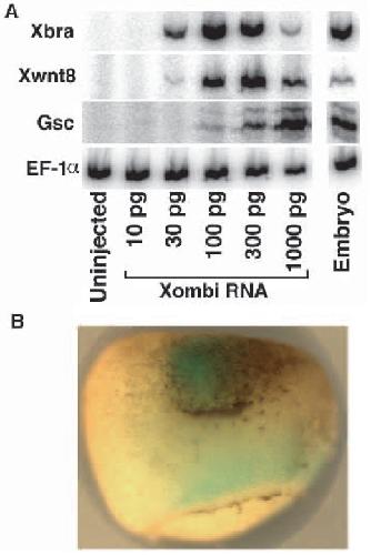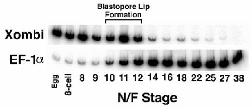 Expression cloning of a Xenopus T-related gene ( Xombi) involved in mesodermal patterning and blastopore lip formation. , Lustig KD , Kroll KL , Sun EE, Kirschner MW ., Development. December 1, 1996; 122 (12): 4001-12.