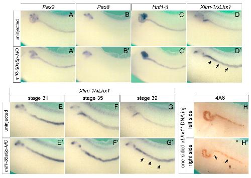 The miR-30 miRNA family regulates Xenopus pronephros development and targets the transcription factor Xlim1/ Lhx1. , Agrawal R , Tran U , Wessely O ., Development. December 1, 2009; 136 (23): 3927-36.