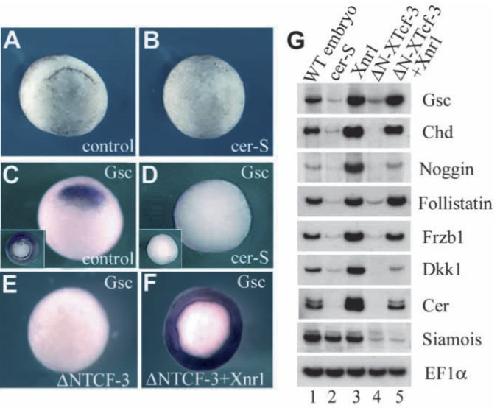 Patterning by genes expressed in Spemann''s organizer. , De Robertis EM , Kim S, Leyns L, Piccolo S , Bachiller D, Agius E , Belo JA , Yamamoto A, Hainski-Brousseau A, Brizuela B, Wessely O , Lu B , Bouwmeester T., Cold Spring Harb Symp Quant Biol. January 1, 1997; 62 169-75.