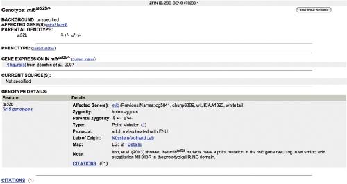 The Zebrafish Information Network: the zebrafish model organism database provides expanded support for genotypes and phenotypes., Sprague J, Bayraktaroglu L, Bradford Y, Conlin T, Dunn N, Fashena D, Frazer K, Haendel M, Howe DG, Knight J, Mani P, Moxon SA, Pich C, Ramachandran S, Schaper K, Segerdell E, Shao X, Singer A, Song P, Sprunger B, Van Slyke CE, Westerfield M., Nucleic Acids Res. January 1, 2008; 36 (Database issue): D768-72. |