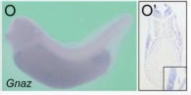 The gnaz gene encodes a g-protein alpha subunit which is a signaling molecule localized to the cell membrane. It is expressed in the brain, spinal cord, cranial ganglia, retina, and pronephros during d...[+]