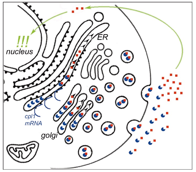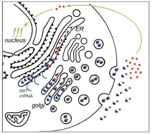 space. Cpl1 (in blue) is constitutively secreted and thereby traverses