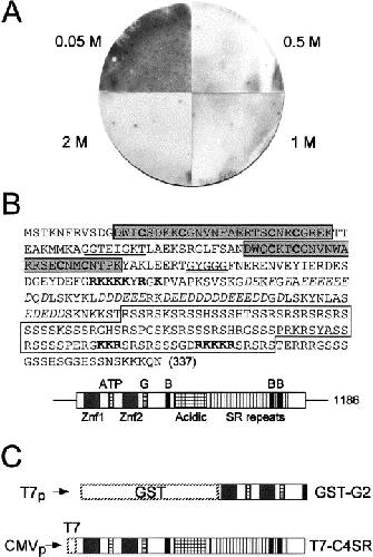 Fig. 1. Cloning of Xenopus C4SR, primary structure of the protein and composition of recombinant proteins expressed. (A) Selection of RNAbindingproteinsfromthe lgt11expression library.Theplaque-liftmembranewasincubatedinthepresenceof32P-labelledriboprobe.Themembrane was rinsed in binding buffer and quartered, and each quarter was washed extensively in buffer containing either 0.05, 0.5, 1.0 or 2.0 NaCl before setting up for autoradiography. In general, plaques for subcloning and sequencing were selected as those giving positive signals after the 0.5 M NaCl washes. (B) Amino acid sequence of C4SR and box diagram of motifs and domains. The two zinc-finger motifs (letters in shaded boxes labelled Znf1 and Znf2); a region rich in aspartic and glutamic acid residues (italic letters D and E and cross-hatched box labelled acidic); a region containing many repeats of the sequence serine–arginine (boxed and vertical stripes labelled SR-repeats); a putative nucleotide triphosphate-binding site (underlined and horizontal striped box labelled ATP); a glycine-rich ‘hinge’ (double-underlined and horizontally striped box labelled G); three regions rich in arginine and lysine residues (bold letters and black boxes labelled B), which could be used for nuclear import. The total length of the cDNA sequence is 1186 bp, and the 5∞ and 3∞ UTRs are shown as single lines. (C) Composition of the two fusion proteins used in this study: GST-G2 is expressed in bacteria from the bacteriophage T7 promoter (T7p) and consists of glutathione-S-transferase (broken box labelled GST) fused to the zinc-finger region encoded by cDNA clone G2; T7-C4SR is expressed from the cytomegalovirus promoter (CMVp) and consists of the complete coding sequence of C4SR with a bacteriophage T7-epitope (broken box labelled T7) inserted at the amino terminus.