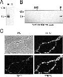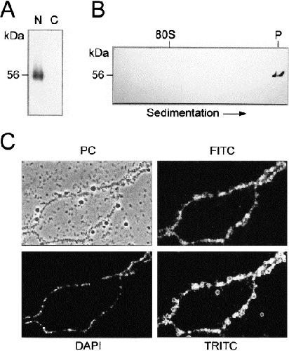 Fig. 3. Expression of recombinant C4SR in Xenopus oocytes. (A) Nuclei and cytoplasms were separated under oil at 18 h after microinjection of plasmid DNA into oocyte nuclei. The recombinant protein, tagged with T7-epitope, was detected after SDS-PAGE by immunoblotting with anti-T7 monoclonalantibody.AsinglebandwithapparentMWof56 kDawasdetected onlyinthenuclearextract(equivalent to10nuclei).(B)Immunoblot of extract of 40 nuclei from microinjected oocytes, fractionated by centrifugation through a 5 ml linear gradient of 10–30% glycerol at 30000 rpm for 3 h in a SW55 rotor (Beckman). (C) Immunostaining of lampbrush chromosomes isolated from the nuclei of microinjected oocytes. The chromosome preparations were immunostained using mouse anti-T7, to detect recombinant C4SR, and rabbit anti-p116, to detect endogenous snRNA U5-associated protein p116. C4SR was visualized with fluorescein-conjugated anti-mouse IgG (FITC), and p116 was visualized with rhodamine-conjugated anti-rabbit IgG (TRITC). The preparations were counterstained with 4,6-diamidino-2-phenylindole to detect DNA (DAPI) and were also viewed by phase contrast (PC).
