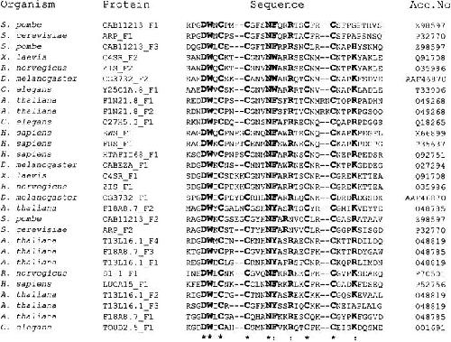 Fig. 4. Definition of a novel C2–C2 zinc-finger motif. Amino-acid sequences were aligned using the program ClustalW. Protein names were taken from database entries (Accession Nos are given). The label ‘F1–4’ after the protein name denotes the zinc-finger number within a given protein, which ranges from one to four. Invariant residues are denoted by an asterisk, and highly conserved residues by a semi-colon. The consensus is: [DWxCx1–4CxxxNaxxRxxCx2–4Cxxx+] where ‘+’ denotes basic and ‘a’ aromatic. Note that in two yeast examples, the conserved arginine is positioned at two, rather than at three, residues after the conserved aromatic. Furthermore, the basic residue, four positions after the fourth cysteine is present in all but three cases. In addition to the highly conserved residues, which are highlighted, other shared features are noted; for example, the conserved aspartic acid is often preceded by glycine. We suggest the name ‘(DW)C4 zinc-finger motif’, as the aspartic acid (D) and tryptophan (W) residues always precede the first cysteine. References, where available, are given in the text.
