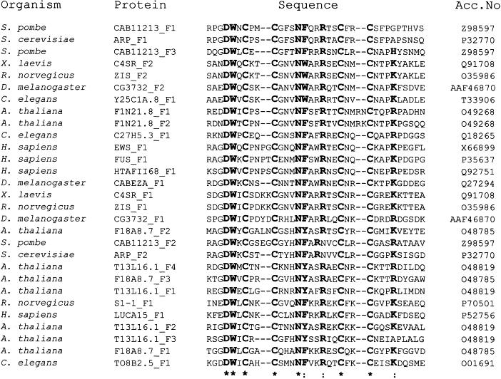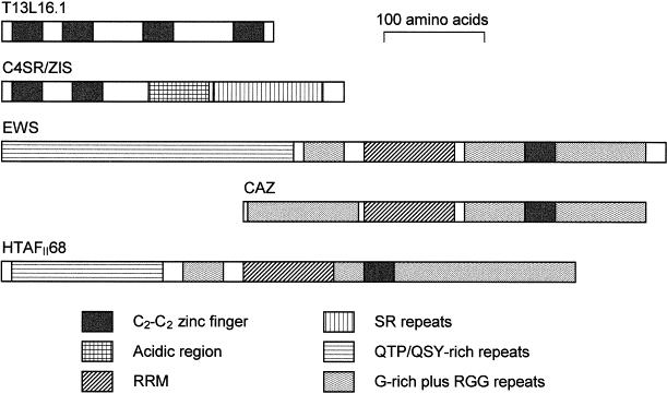 Fig. 5. Location of the (DW)C4 zinc-finger motif with respect to other motifs in a range of proteins. In the Arabidopsis protein T13L16.1, the zinc finger is the only identifiable motif throughout the protein and is repeated four times. Xenopus C4SR, rat Zis, mouse Zfp265 and human ZIS are very similar in structure. In human EWS (in addition to FUS/TLS, not shown), Drosophila CAZ (Cabeza) and human HTAFII68, the zinc finger is present in combination with the RNA-binding domains: RRM and arginine–glycine–glycine (RGG) repeats. The sequences of the zinc-finger motifs are as listed in Fig. 4.