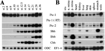 Patched (Ptc) is a putative twelve transmembrane domain protein that is both a Hedgehog (Hh) receptor and transcriptional target of Hh. In this study, we isolated Xenopus Ptc cDNAs, Ptc-1 and Ptc-2, and carried out comparative analyses on their expression patterns. The putative Ptc-2 protein has a long C-terminal extension that has similarities in both length and sequence to those of Ptc-1 proteins in mouse, chick and human. In both early embryogenesis and hindlimb development, Ptc-2 expression is restricted to cells that receive a Hh signal, a pattern similar to that of Gli-1. Ptc-1, however, shows a broader distribution, mainly non-overlapping with that of Ptc-2. Despite the difference in their expression patterns, both are induced in animal cap explants synergistically by Shh and Noggin, showing a conserved regulation in their activation mechanisms.