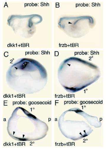 Fig. 2. dkk1 but not frzb induces complete prechordal plates. (A,B) In situ hybridization with sonic hedgehog (Shh) in embryos coinjected at the four-cell stage ventrally with tBR and either dkk1 (A) or frzb (B). Stage-30 embryos are shown from the anterior. Arrowhead indicates the anterior limit of Shh expression. (C-D) in situ hybridization for Shh in embryos injected at the four-cell stage ventrally with nuclear lacZ lineage tracer, tBR and either dkk1 (C) or frzb (D). Stage-16 embryos were cut sagittally; secondary axes are marked by light blue β-gal staining. Arrowheads indicate the anterior limit of secondary Shh expression. Note that the expression in the prechordal plate in (D) is lacking. (E,F) In situ hybridization for goosecoid (gsc) in embryos injected as in A and B. Sagittal sections of stage-14 embryos are shown. Arrowheads indicate the mesodermal zone of gsc expression in the anterior mesoderm of the induced secondary axis (2. Note that mesodermal gsc expression extends anterior to the neuroectodermal in the primary axis (1 and secondary axis induced by dkk1, but is in register with the neural expression in frzb-injected embryos (F). a, anterior; p, posterior. |