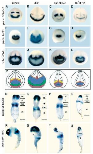 Fig. 4. dkk1 regulates anteroposterior patterning of neurectoderm. (A,E,I) control embryos, (B,F,J) embryos injected radially at the four-cell stage with dkk1 (C,G,K) embryos injected with anti15 Ab into the blastocoel and (D,H,L) embryos treated with 10â7 M retinoic acid (RA). In situ hybridization for BF1 and En2 (A-D), Xanf1 (E-H), and XOtx2 (I-L). Midgastrula-stage embryos (stage 15) are shown from anterior, dorsal side up.
