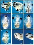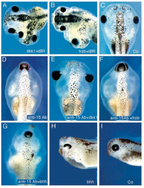 Fig. 1. dkk1 but not frzb induces complete secondary heads. Coinjections of tBR mRNAs with dkk1 (A) or frzb (B) into ventral blastomeres of four-cell embryos results in the development of secondary heads with two eyes or one eye, respectively. Embryos shown are 4 days postfertilisation (pf). (C-G) dkk1 rescues the cyclopic phenotype elicited by anti15 Ab, while frzb and bhh are unable to rescue cyclopia. Embryos are day 6 pf, shown from the dorsal side, anterior up. (C) Uninjected control embryo. (D) Embryo injected with anti15 Ab into the blastocoel. (E) Embryo injected radially with dkk1 mRNA and anti15 Ab. (F) Embryo injected radially with frzb mRNA and anti15 Ab. (G) Embryo injected radially with bhh mRNA and anti15 Ab. (H) Embryo injected radially with bhh mRNA. (I) Uninjected control embryo. |