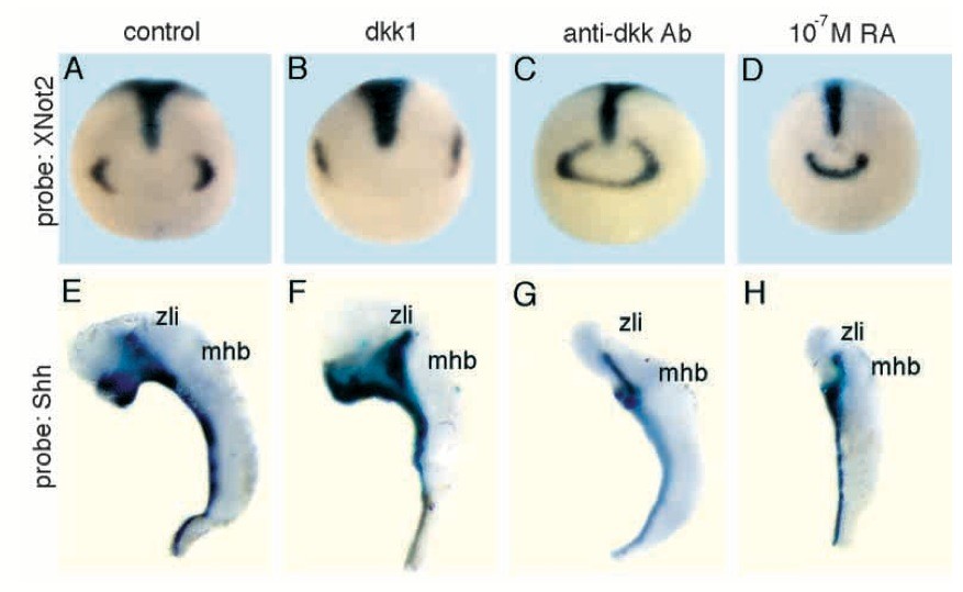 Fig. 5. dkk1 regulates dorsoventral patterning of neuroectoderm. (A,E) Control embryo, (B,F) embryos radially injected at the four-cell stage with dkk1, (C,G) injected with anti15 Ab into the blastocoel and (D,H) treated with 10â7 M RA. In situ hybridisation for XNot2 (A-D) and Shh (E-H).