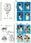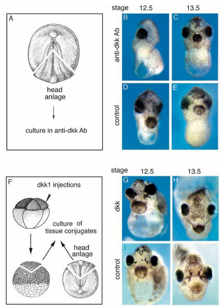 Fig. 6. Timing of dkk1 action. (A,F) Schematic drawings of experiments. The anterior halve of the gastrocoel roof containing the head anlage was excised from stage 12.5 or 13.5 embryos and cultured in the presence of anti14 (control, D,E) or anti15 Ab (B,C) until stage 20, then transferred to 0.5Barth solution and cultured for an additional 24 hours. Note cyclopia in (B). (F-J) Anterior halves of gastrocoel roof excized from stage-12.5 or -13.5 embryos were conjugated with animal caps, injected with dkk1 mRNA (G,H) or control animal caps (I,J) and cultured for 2 days. Note that the head in G is strongly anteriorised. |