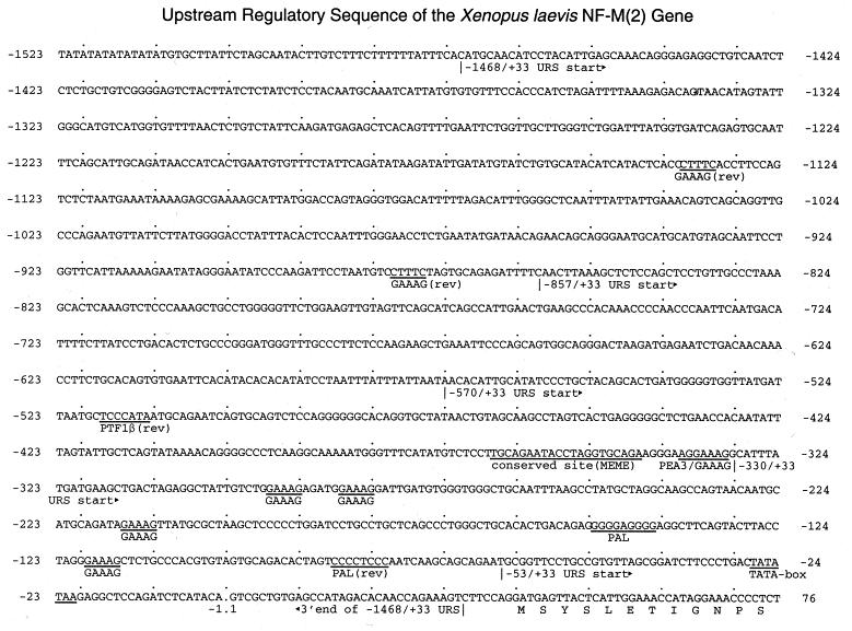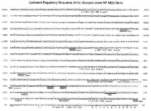 Fig. 1. Sequence of the upstream regulatory region of the Xenopus laevis NF-M(2) gene. The nucleotide marking the start of transcription is designated +1, whereas the one immediate upstream is −1. All others are numbered relative to this. Nucleotides of various features discussed in the text are underlined and labeled underneath. The beginning and end of the various deletion constructs used in the plasmid embryonic injection experiments are also designated below the appropriate nucleotide sequences. The initial codons of the predicted sequence of the NF-M(2) protein are labeled below the sequence with the single amino acid code. The full sequence of the NF-M(2) gene is available from GenBank under accession number AF237379.