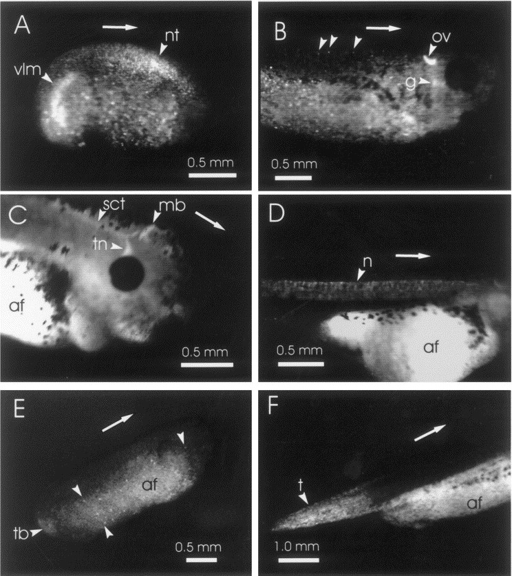 Fig. 4. GFP-reporter gene expression [pNF-M(2)URS-GFP] in living transgenic pigmented embryos and tadpoles. Animals were photographed with a Dage CCD 300 video camera on an Olympus SZX12 fluorescence-dissecting microscope. Arrows indicate the orientation of the posterior (left) to anterior (right) axis. (A) GFP expression in scattered epidermal cells, dorsal axial structures (nt, neural tube), and undifferentiated ventro-lateral mesoderm (vlm) of JR27-1 at stage 22, several hours before endogenous NF-M(2) expression. (B) GFP expression in the ear (ov), gill (g) arches (slightly out of focus) and scattered epidermal cells (examples at unlabeled arrowheads) of JR27-2 at stage 33/34. (C) GFP expression in midbrain (mb), descending spinal tracts (sct) and trigeminal nerve (tn) of JR27-10 at stage 37/38. (D) GFP expression in notochord (n) of JR27-15 at stage 41. (E) GFP expression in tail bud (tb) and scattered epidermal (examples at unlabeled arrowheads) cells of JR27-2 at stage 26. (F) GFP expression in tail (t) of JR27-11 at stage 37/38. Autofluorescence within the ventral yolk mass is labeled “af” in panels (C)–(F).