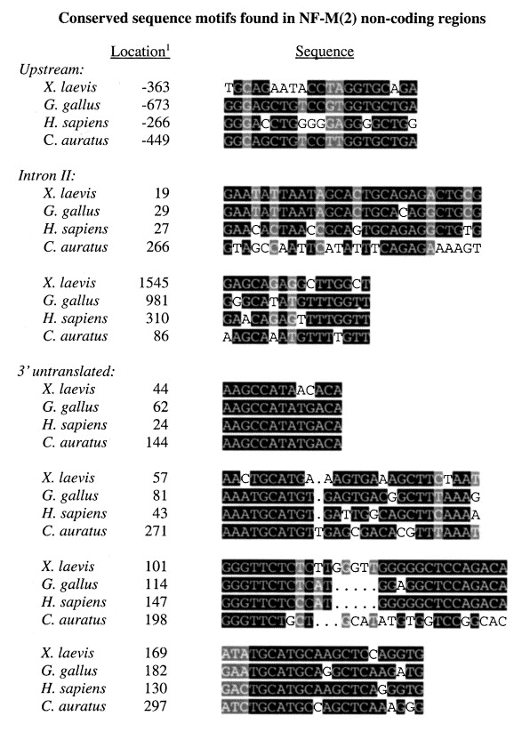 Fig. 6. Conserved sequence motifs found in non-coding regions of the NF-M(2) gene. Sequences were initially identified by the “Meme” routine of version 10 of GCG. Groups of sequences from each of the species listed were run separately for each untranslated region of the NF-M gene (upstream regulatory, intron I, intron II and 3′ untranslated). Numbers in the location column designate the position of the beginning of each sequence alignment relative to the beginning of the first exon (upstream sequence), the start of the intron (intron II) or the termination codon (3′ untranslated), respectively, for each group of sequences. Nucleotides that are shared among at least three of the four species are shaded in black; and those that are shared among two of the four are shaded in gray. See the text for a full description of the parameters.