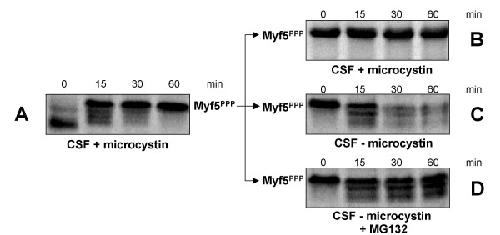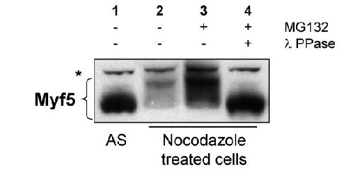 Lindon, Constitutive instability of muscle regulatory factor Myf5 is distinct from its mitosis-specific disappearance, which requires a D-box-like motif overlapping the basic domain. 2000, Pubmed
