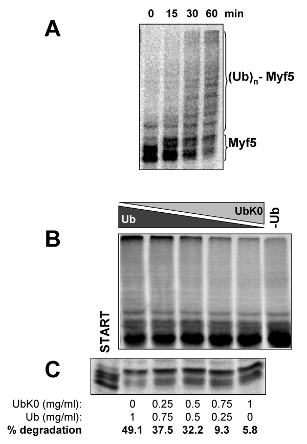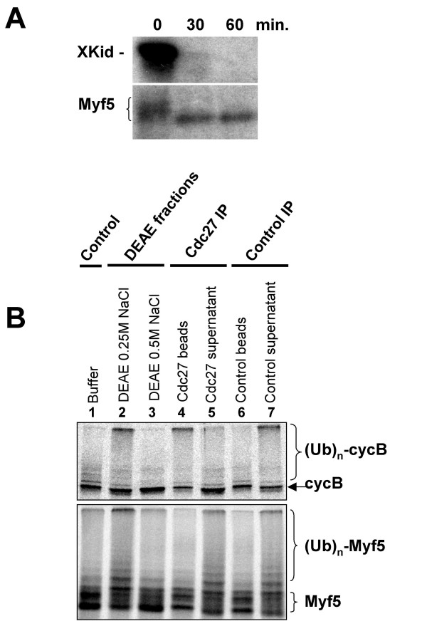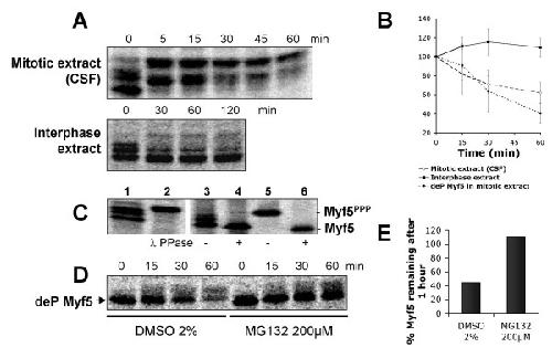 The two myogenic regulatory factors Myf5 and MyoD are basic helix-loop-helix muscle transcription factors undergoing differential cell cycle dependent proteolysis in proliferating myoblasts. This regulated degradation results in the striking expression of these two factors at distinct phases of the cell cycle, and suggests that their precise and alternated disappearance is an important feature of myoblasts, maybe connected to the maintenance of the proliferative status and/or commitment to the myogenic lineage of these cells. One way to understand the biological function(s) of the cyclic expression of these proteins is to specifically alter their degradation, and to analyze the effects of their stabilization on cells. To this aim, we undertook the biochemical analysis of the mechanisms governing Myf5 mitotic degradation, using heterologous systems. We show here that mitotic degradation of Myf5 is conserved in non-myogenic cells, and is thus strictly under the control of the cell cycle apparatus. Using Xenopus egg extracts as an in vitro system to dissect the main steps of Myf5 mitotic proteolysis, we show that (1) Myf5 stability is regulated by a complex interplay of phosphorylation/dephosphorylation, probably involving various kinases and phosphatases, (2) Myf5 is ubiquitylated in mitotic extracts, and this is a prerequisite to its degradation by the proteasome and (3) at least in the Xenopus system, the E3 responsible for its mitotic degradation is not the APC/C (the major E3 during mitosis). Altogether, our data strongly suggest that the mitotic degradation of Myf5 by the ubiquitin-proteasome system is precisely controlled by multiple phosphorylation of the protein, and that the APC/C is not involved in this process.