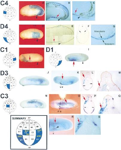 Figure 2. Blastomeres Contributing to Primitive and Definitive Blood Compartments in the Xenopus Embryo Individual blastomeres of the 32-cell stage embryo were injected with beta-gal mRNA, embryos collected at stage 26 of development, and beta-gal localization detected followed by in situ hybridization where appropriate. Nomenclature of blastomeres is according to Nakamura and Kishiyama (1971). (A) Typical C4 beta-gal injected embryo. (B) Sagittal section of embryo in (A) after whole mount in situ hybridization for beta-T4 globin. Globin expression, red arrow; black arrowhead, proctodeum. S, somites. (C) Close-up of section in (B) showing that C4 does not contribute to the posteriorVBI. (D) Typical D4 beta-gal injected embryo. and indicate the A/P position of the sections depicted in (F) and (G), respectively. (E) Photoshop montage of a 10 um sagittal section of a D4 beta-gal embryo showing D4 contribution to the posteriorVBI (red arrow). Black arrowhead, proctodeum. (F) Ten micrometer transverse section at the level of the posteriorVBI of a D4 beta-gal embryo showing that D4 contributes to the posteriorVBI, the posterior-lateral mesodermal layer, and to posteriorendoderm, but does not contribute to the DLP (black arrows). n, notochord. (G) Close-up of an 80 um vibratome section of another D4 embryo at a similar A/P position to (F), showing D4 contribution to the posteriorVBImesoderm and to a few ventral endodermal cells. This section shows bilateral staining for beta-gal as a result of leakage of RNA in to the sister D4 blastomere, a phenomenon which occurred more frequently with vegetal blastomeres compared with others. (H) Typical C1 beta-gal injected embryo. The red arrow indicates beta-gal cells located in the anteriorVBI. Black arrowhead, proctodeum. Note that C1 does not contribute to the DLP. (I) Typical D1 injected embryo showing beta-gal activity in the VBI (red arrow) and in lateralendoderm, but no contribution to the DLP. Black arrowhead, proctodeum. (J) Typical D3 beta-gal injected embryo. (K) D3 injected embryo after in situ hybridization with an SCL probe. Red arrow, SCL expression in the DLP; black arrow, SCL staining in the VBI. and indicate level at which sections represented in (L) and (M) were taken.
