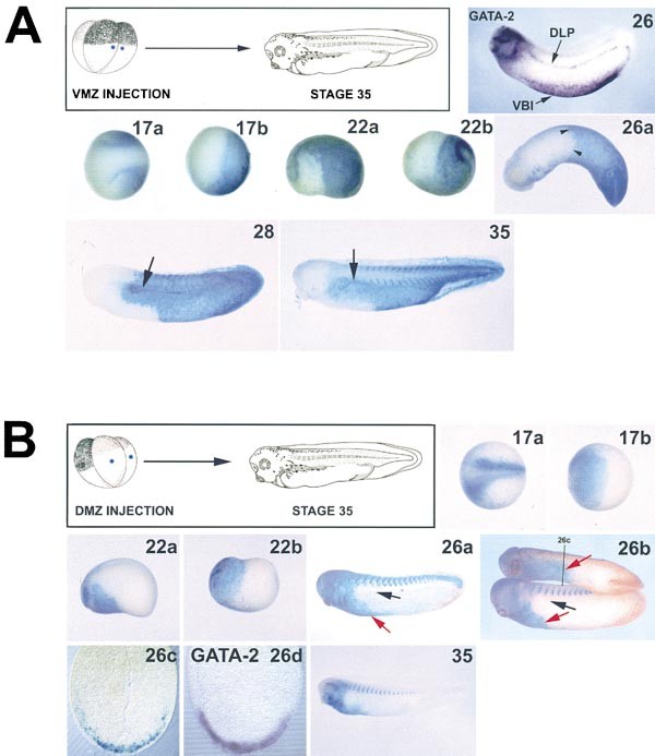 (B) Time course from stage 17 to stage 35 showing ï°-gal localization in DMZ injected embryos. Numbers at the top right corner in- dicate stage of development. 26a shows a benzyl benzoate/benzyl alcohol cleared em- bryo. Notice total absence of ï°-gal staining in the DLP region (black arrow). 26c, transverse section at the level of the anteriorVBI of em- bryo in 26b. 26d, transverse section of a stage 26 embryo showing GATA-2 expression in the region of the anteriorVBI. 17a, dorsal view. 17b, 22b, and 26b, top embryo, ventral views. 22a, 26a, 26b bottom embryo, and 35, lateral views. Ventral is to the bottom in all cases. In whole mounts anterior is to the left. Black arrow indicates the position of the DLP. Red arrows indicate B-gal localization in the ante- rior VBI.