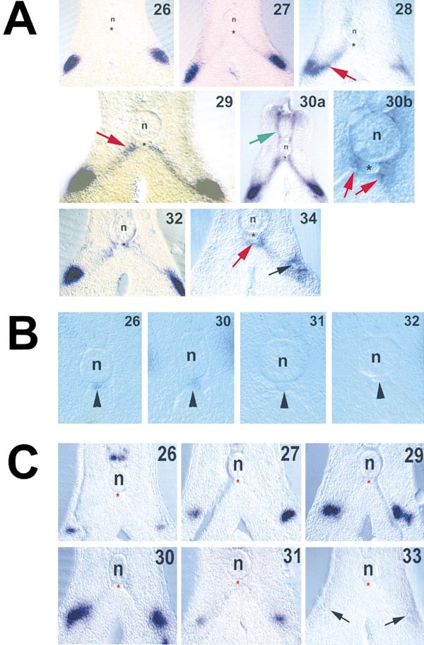 Figure 3. In Situ Hybridization Revealing Ex- pression of XFli-1, VEGF, and SCL in the DLP- Hypochord Region (A) Time course from stage 26 to 34 showing XFli-1 expression in the DLP-hypochord re- gion. Numbers at the top right corner indicate the stage of development. 30b shows a high magnification view of the hypochord region. Position of the notochord (n) and hypochord (black asterisk) are indicated. Red arrows in- dicate the position of the migrating XFli-1 positive cells. Green arrow in 30a points to XFli-1-positive cells migrating from the dorsal fin to the hypochord. Red arrow in 34 indicates XFli-1 cells located in the forming dorsal aorta. Black arrow in 34 indicates the position of the posterior cardinal vein.