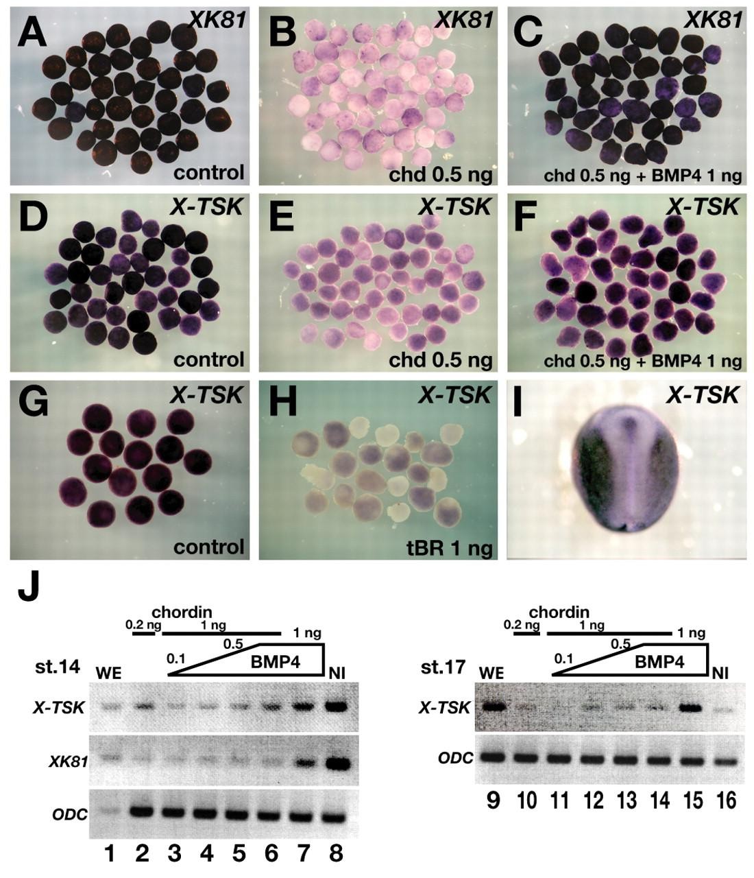 Fig. 2. X-TSK expression requires BMP signaling. Results of the animal cap (AC) assays. (A-H) Animal caps were prepared from stage 8-9 embryos injected with 0.5 ng Chordin (B,E), 0.5 ng Chordin + 1 ng BMP4 (C,F), 1 ng truncated BMP-receptor (tBR) (H), or none of the above (controls; A,D,G). ACs were harvested at the time equivalent to stage 14 and hybridized with XK81 (A-C) or X-TSK (D-H) probes. Chordin downregulated XK81 expression (B), which was rescued by BMP4 (C). The expression of X-TSK was repressed by Chordin (E), but rescued by BMP4 (F). (H) Truncated BMP receptors repressed the expression of X-TSK. (I) X-TSK expression in a normal embryo at stage 17. (J) RT-PCR analysis with ACs harvested at stages 14 (lanes 1-8) and 17 (lanes 9-16). ODC is used as an internal control. X-TSK expression in the ACs was recovered by increasing amounts of BMP4. BMP4 overexpression induced X-TSK expression at both stages. WE, whole embryo; NI, non-injected ACs.