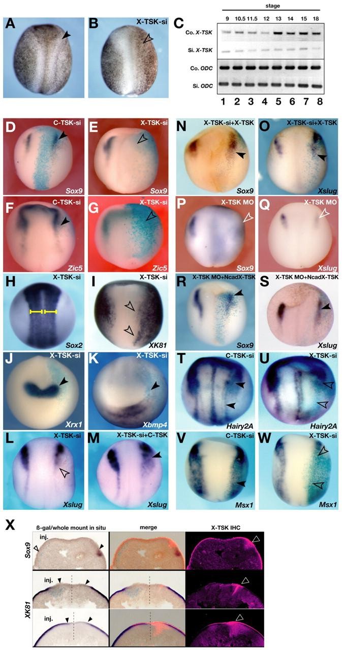 Fig. 4. Effects of X-TSK depletion using siRNA on ectodermal patterning. (A) A normal Xenopus embryo at stage 17; the arrowhead shows the neural fold. (B) Stage 17; an embryo injected with X-TSK siRNA (X-TSK-si). The arrowhead shows a flattened neural fold and enhanced pigmentation. (C) RT-PCR analysis of embryos injected with siRNA radially into all blastomeres at the four-cell stage. The embryos were harvested at the appropriate stages. ODC is used as an internal control. Co, Control embryo; Si, X-TSK-si-injected embryo. (D-S) Whole-mount in situ hybridization of injected samples at stage 15. The injected samples are indicated in the upper right-hand corner, and the probes are in the lower right-hand corner. All pictures show the injected side on the right. The results are described in Table 1, except M-O,R,S. (D,F) An embryo injected with C-TSK siRNA (C-TSK-si). The expression of Sox9 and Zic5 was unchanged (arrowheads). (E,G) An embryo injected with X-TSK siRNA (X-TSK-si). The expression Sox9 or Zic5 was not observed (arrowheads). (H) Sox2 expression was not disturbed in the X-TSK-si-injected embryo. The bars indicate the width of neural plates. (I) Epidermal keratin was activated in the X-TSK-si-injected side (arrowheads). (J) Xrx1 expression was not disturbed in the X-TSK-si-injected side (arrowhead). (K) Xbmp4 expression was not activated (arrowhead). (L,M) Results of the rescue experiment with co-injection of X-TSK-si and mRNAs. (L) X-TSK-si (0.5 pmol) injection diminished Xslug expression (arrowhead). (M) X-TSK-si (0.5 pmol) and C-TSK mRNA (0.5 ng) were injected into one blastomere of a stage 2 embryo. Xslug expression was weak, but regionally rescued (arrowhead). (N,O) X-TSK-si (0.5 pmol) and X-TSK mRNA (250 pg) were injected. (N) Sox9 expression was slightly extended alongside β-gal staining (arrowhead). (O) Xslug expression was restored to the same level as control side (arrowhead). (P,Q) An embryo injected with a morpholino oligo of X-TSK (X-TSK MO) (5 ng). Neural crest marker expression, Sox9 (P) and Xslug (Q) levels were decreased. (R,S) X-TSK MO phenotype is restored by X-TSK in which the signal peptide is replaced with N-cadherin signal peptide. The sequence around the initiation codon, which is a MO target, is swapped for the N-cadherin sequence. (R) Sox9 expression was observed alongside β-gal-positive cells (arrowhead). (S) Xslug expression was restored (arrowhead). (T-W) The pre-neural crest genes in injected embryos. (T,V) C-TSK-si did not change the expression of Hairy2A or Msx-1 (arrowheads). (U,W) X-TSK-si diminished Hairy2A and Msx-1 expression in the cranial to trunklateral neural plate (open arrowheads). (X) Triple staining sections. Sox9 and XK81 phenotypic embryos are sectioned, and stained using anti-X-TSK antibody. (Top) Sox9 expression is missing in the β-gal-positive region (left, open arrowhead) and neural crest expression of X-TSK has also disappeared in the injected side (left). Normal expression of X-TSK protein was observed as red fluorescence (right, triangle). (Middle) The border of epidermis is indistinguishable in anterior neural plate area; X-TSK protein levels are diminished in β-gal-positive region. (Bottom) The trunk region of epidermis is clearly enhanced on the injected side (arrowheads). Arrowheads indicate the epidermal borders. X-TSK protein was seen only in the non-injected side (right, triangle).