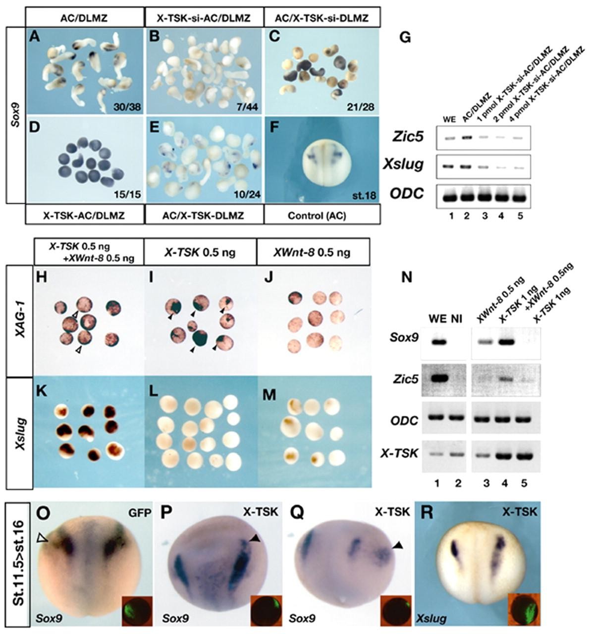 Fig. 5. X-TSK induces the neural crest when in combination with Wnt. (A-E) Conjugate assay of ACs (stage 8-9) and the dorsolateral marginal zone (DLMZ) (stage10.5) analyzed by whole-mount in situ hybridization with a Sox9 probe. The numbers of phenotypic explants are described in the lower right-hand corners. (A) Sox9 expression in the conjugate of a non-injected animal cap and non-injected DLMZ. (B) The conjugate of X-TSK-si-injected AC and DLMZ; Sox9 expression is decreased. (C) The conjugate of AC and X-TSK-si-injected DLMZ. (D) The conjugate of X-TSK overexpressing AC and DLMZ; Sox9 is expressed in all explants. (E) The conjugate of AC and X-TSK expressing DLMZ. (F) The expression of Sox9 at the same stage as ACs. (G) RT-PCR analysis of the AC/DLMZ conjugate assay. X-TSK-si (0-4 pmol) was injected into the animal blastomeres evenly. (H-M) Whole-mount in situ hybridization analysis of the animal cap assay. ACs were prepared from stage 8-9 embryos injected with 0.5 ng X-TSK + 0.5 ng XWnt-8 (H,K), 0.5 ng X-TSK (I,L), or 0.5 ng XWnt-8 (J,M). ACs were harvested at the time equivalent to stage 21/22 and hybridized with XAG-1 (H-J) and Xslug (K-M) probes. (N) RT-PCR analysis of the animal cap assay. ODC was used as an the internal marker. The amount of injected X-TSK mRNA was 1 ng/embryo, which is enough to induce anterior markers. XWnt-8 mRNA (0.5 ng) was co-injected with X-TSK. X-TSK induced neural crest marker expression in combination with XWnt-8. (O-R) The embryos are transfected by the mRNA electroporation at stage 11.5 after gastrulation. The distribution of GFP fluorescence is indicated in the inset of each figure. (O) Sox9 expression in GFP mRNA transfected embryo. (P) A variation of X-TSK transfected embryo. Sox9 expression is extended to anterior side (arrowhead). (Q) A variation of X-TSK transfected embryo. Sox9 expression is ectopically observed (arrowhead), but endogenous expression was interfered by ectopic expression of X-TSK. (R) Xslug expression is also affected.