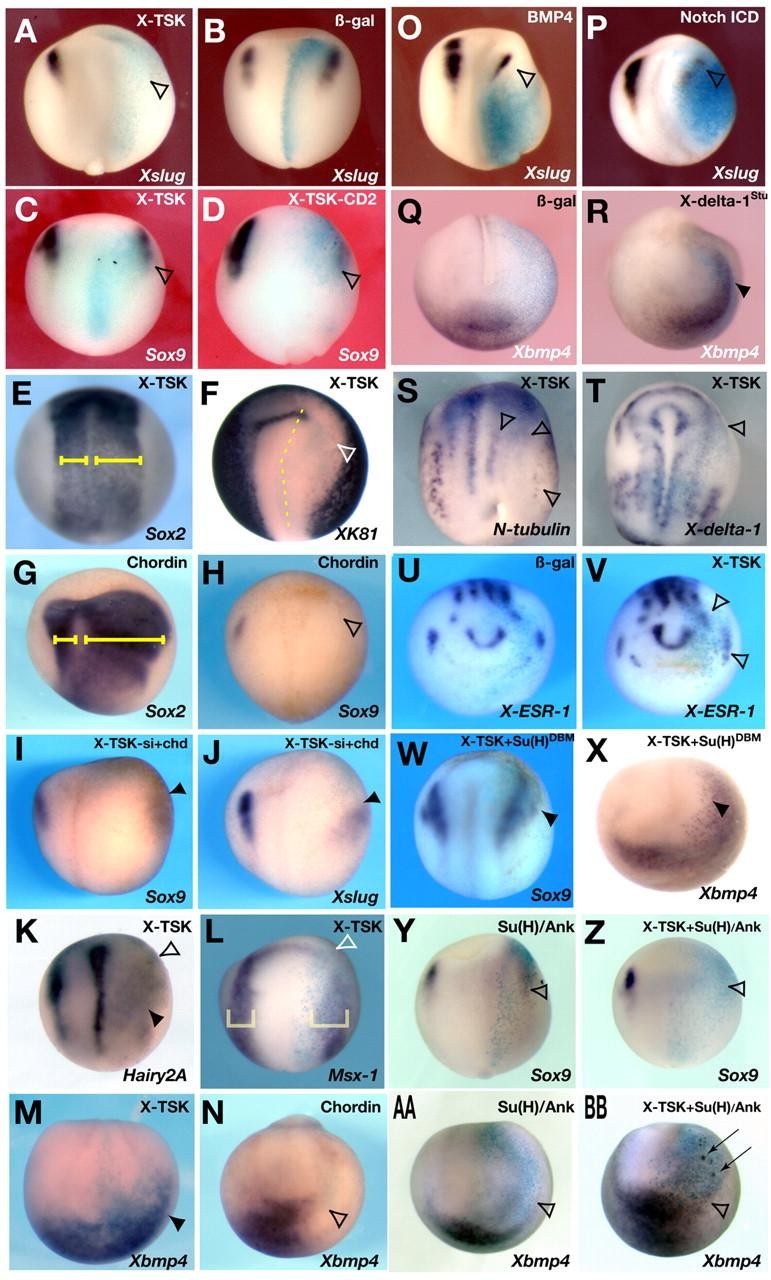 Fig. 6. X-TSK interacts with the Notch signaling pathway. Whole-mount in situ hybridization analysis of mRNA-injected embryos. Injected samples are indicated in the upper right-hand corners; probes are indicated in the lower right-hand corner. (A,C) Neural crest markers Xslug (A) or Sox9 (C) disappeared or diminished (arrowheads) with X-TSK (1 ng) overexpression. (B) The β-gal mRNA (0.5 ng) injection had no effect. (D) X-TSK-CD2 mRNA (1 ng) showed a similar effect to that in C. (E) Sox2 expression expanded laterally (right bar) in the X-TSK (1 ng)-injected side. (F) Epidermal keratin levels diminished. The anterior border disappeared on the injected side (open arrowhead). (G) An embryo injected with Chordin (100 pg). The Sox2-expressing neural plate is expanded (right bar). (H) An embryo injected with Chordin (100 pg). Expression of the neural crest marker Sox9 diminished (arrowhead). (I,J) X-TSK-si (0.5 pmol) and Chordin mRNA (100 pg). Faint expression of Sox9 (I) or Xslug (J) was observed in the far lateral side (arrowheads). (K) Hairy2A expression is downregulated on X-TSK-injected side, though it appears to spread over a broader domain (arrowhead and open arrowhead). (L) X-TSK mRNA (1 ng) injection resulted in decreased expression of Msx-1 (arrowhead) though the width of its expression area (right bracket) becomes wider than in the control side. (M) An embryo injected with X-TSK (1 ng). Xbmp4 expression increased outside the injected side (arrowhead). (N) An embryo injected with Chordin (100 pg). Xbmp4 expression disappeared around the β-gal-positive cells (arrowhead). (O) BMP4 (0.5 ng) mRNA and (P) Notch ICD (0.5 ng) injections caused reduction of Xslug expression (arrowheads). (Q) β-Gal mRNA injection did not affect Xbmp4 expression. (R) X-delta-1Stu injected areas are marked by β-gal staining (light blue), the arrowhead indicates ectopic Xbmp4 expression (dark purple). (S,T) An embryo injected with X-TSK. (S) Two out of the three strips of N-tubulin expression disappeared (arrowheads). (T) X-delta-1 expression disappeared on the outer border of the neural crest (arrowhead). (U) β-gal did not affect X-ESR-1 expression. (V) X-TSK mRNA (1 ng) injection resulted in expanded peripheral expression of X-ESR-1 on the injected side (arrowheads). (W,X) Co-injection of 1 ng X-TSK and 0.5 ng Su(H)DBM mRNAs. (W) Diffused signals of Sox9 were observed around the arrowhead. (X) Xbmp4 expression was extended towards theβ -gal-positive side (arrowhead). (Y) Sox9 expression was reduced in Su(H)/Ank 500 pg injected side (arrowhead). (Z) Sox9 expression was completely missing in X-TSK 1 ng+ Su(H)/Ank 500 pg injected side (open arrowhead). (AA) Xbmp4 expression was very weakly inhibited in Su(H)/Ank 500 pg injected side (open arrowhead). (BB) The patchy expression of Xbmp4 was observed in X-TSK 1 ng+ Su(H)/Ank 500 pg injected side (arrows). The expansion of Xbmp4-expressing regions was not observed (open arrowhead).