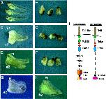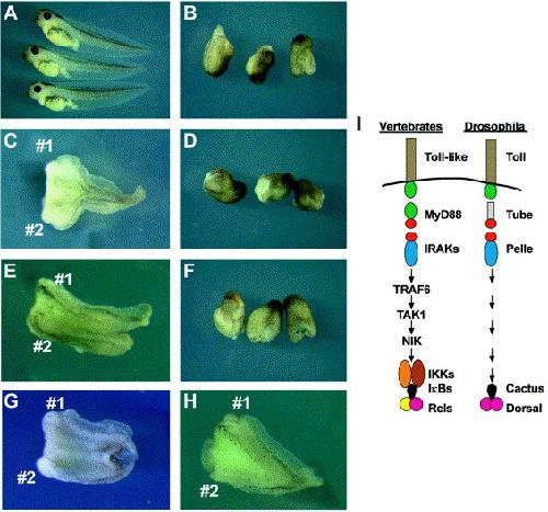 Fig. 2. δNXMyD88 blocks axis rescue in UV-ventralized Xenopus embryos through the Drosophila Toll receptor and its ligand Spätzle, but not through the Drosophila Rel protein Dorsal. Embryos were scored on the dorsoanterior index scale (DAI; Kao and Elinson, 1988), on which 5 represents wildtype, and 0, fully ventralized embryos (for statistical analysis see Table 1). (A) Uninjected wild-type embryos; UV-ventralized siblings (B) were injected into two opposing blastomeres at 4-cell stage to generate two dorsalizing centers with: (C) Spätzle mRNA (500 pg); (D) Spätzle and δNXMyD88 mRNA (500 pg/100 pg). (E) Toll mRNA (500 pg); (F) Toll and δNXMyD88 mRNA (500 pg/100 pg). (G) Dorsal mRNA (500 pg); (H) Dorsal and δNXMyD88 mRNA (500 pg/100 pg). (I) Comparison of vertebrate and Drosophila Toll-like signaling pathways and their epistatic hierarchies.