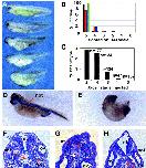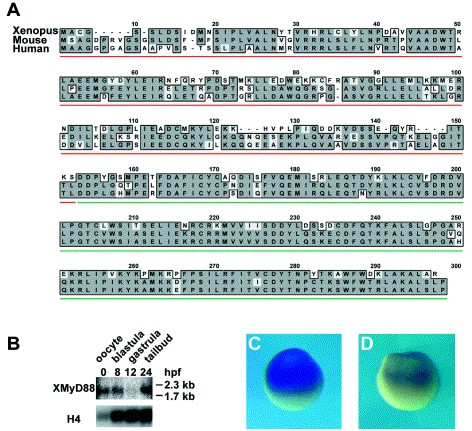 Fig. 1. Sequence and expression profile of Xenopus MyD88. Multiple sequence alignment (A) of frog, mouse and human MyD88 (ClustalW software); light shading â isofunctional amino acids; dark shading â identical residues. Red underlining marks the Death Domain, green underlining the Toll/IL-1 receptor (TIR) homology domain. Developmental expression of XMyD88 by Northern blot (B); in comparison to histone H4 levels, used as a loading control, oocytes contain high amounts of maternal XMyD88 mRNA. Whole-mount RNA in situ hybridization at initial gastrula stage (9 hours post fertilization [hpf]; animal pole up); (C) antisense probe; (D) sense probe.